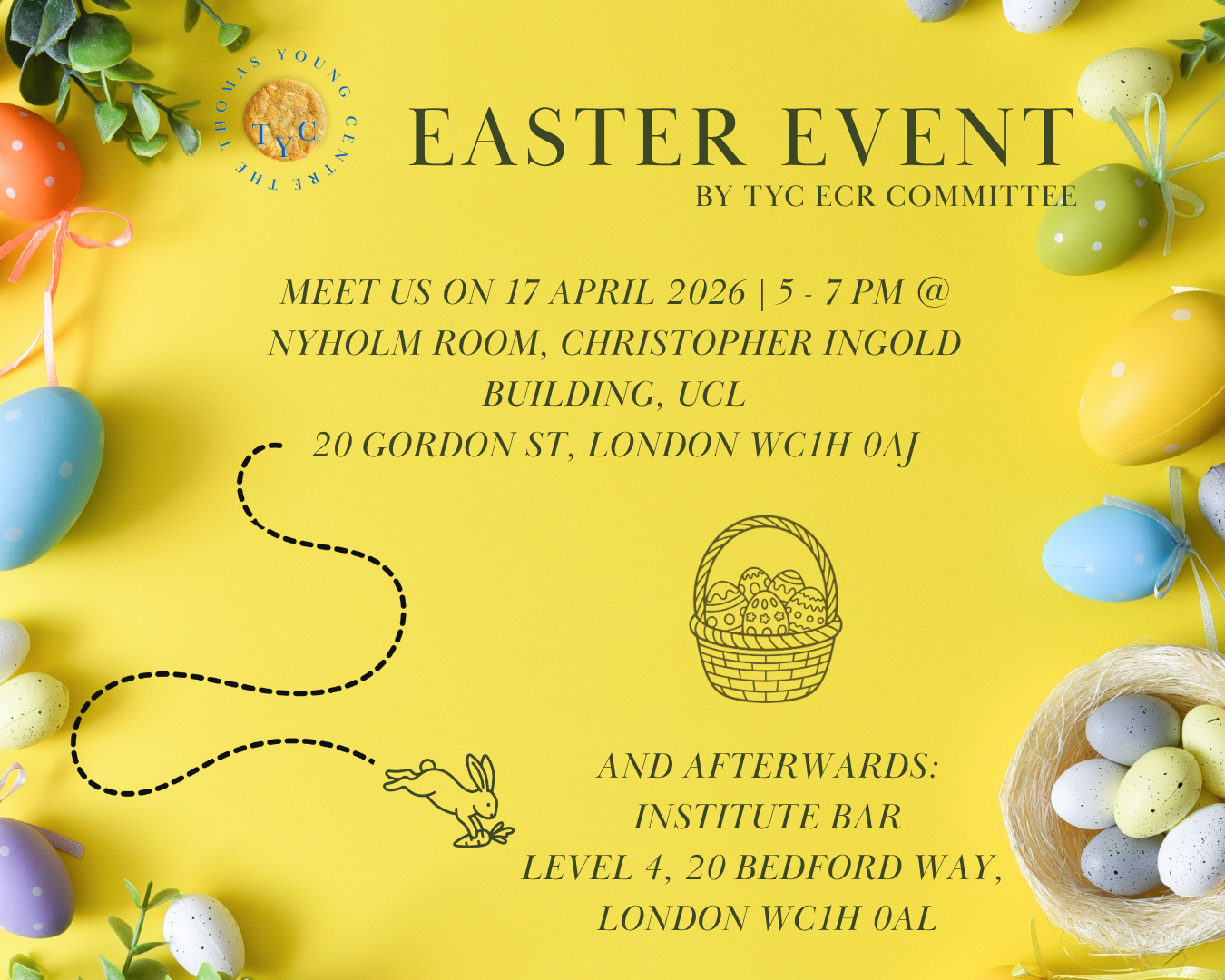 Hence, we are delighted to invite you to our Easter event, which will take place the 17th of April from 5pm in the Nyholm Room, Christopher Ingold Building, followed by the Institute Bar, level 4, 20 Bedford Way, WC1H 0AL.